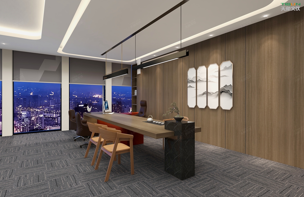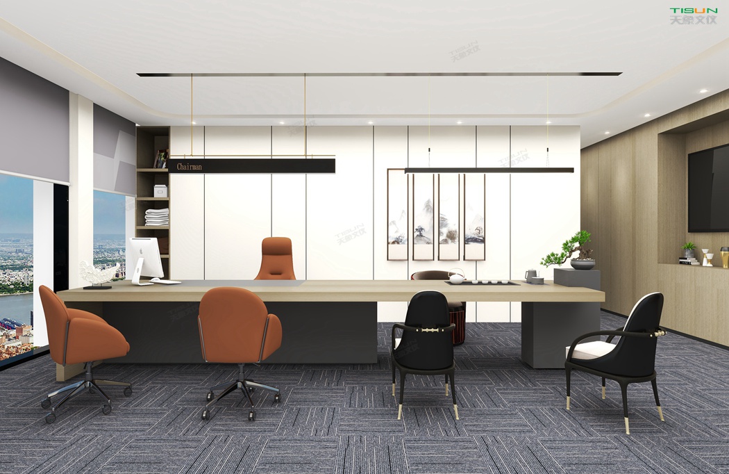 This office furniture is simple in shape, with a small number of turning lines to enrich the connotation of product design. It is matched with the overall customized background wall and bookcase to show the social status and identity of users with a sense of massiness.