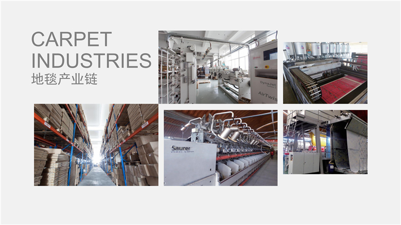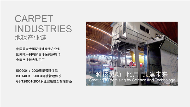 企業擁有眾多國際領先的先進生產設備,其中包括德國威爾頓電腦提花地毯生產線、英國一體化后整理設備、美國多套簇絨地毯生產線、奧地利Zimmer高清印花生產線、BCF滌綸地毯長絲生產線,年產量可生產各類地毯1000多萬平方米,企業自主專利技術研發生產“天絲”特種長絲纖維核心競爭產品,開發多款獨特的高質量產品,具有抗老化、永久性阻燃、耐磨、耐菌、耐污染、持久如新及超長使用壽命等多種優勢性能,是普通傳統纖維絲所無法比擬的,公司通過ISO9001:2000質量管理體系、ISO14001:20004環境管理體系、GB/T28001-2001職業健康安管管理體系認證等,以及先進的生產管理水平,確保地毯產品品質的穩定性和可持續性質量保證。