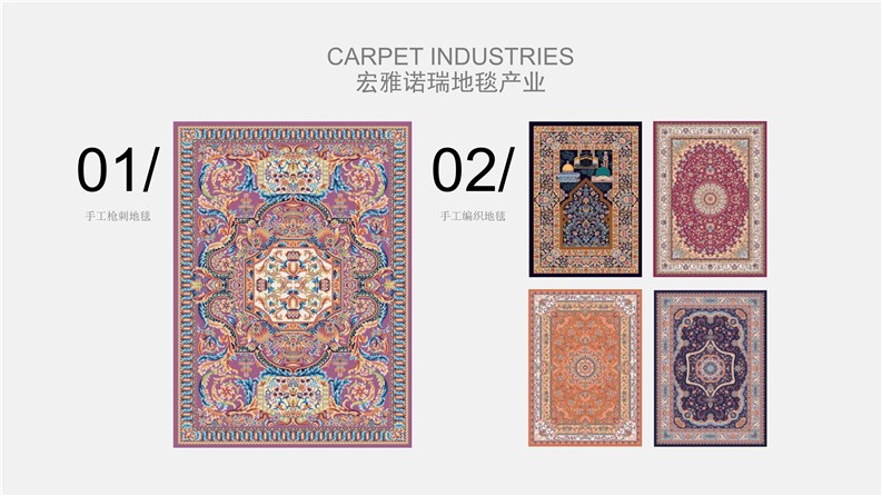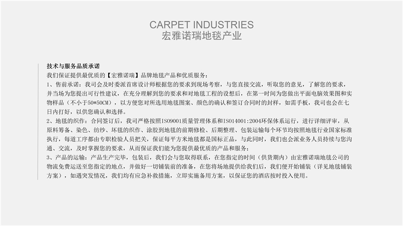 深圳宏雅諾瑞地毯有限公司自2008年創立以來,一直致力于星級酒店、辦公大廈及高端別墅會所提供高品質的產品與優質服務及領先國際水平的售后干洗技術培訓計劃,多年來不斷創新、優化產品結構,一直引領行業發展趨向,宏雅諾瑞地毯產業以綜合性加工生產中高檔機織及手工槍刺地毯為主,集產品研發、設計生產、銷售、鋪裝售后一體化的產業鏈生產企業,企業于2005年在廣州市花都區設立工廠至今,項目輻射全國各地城市地區。